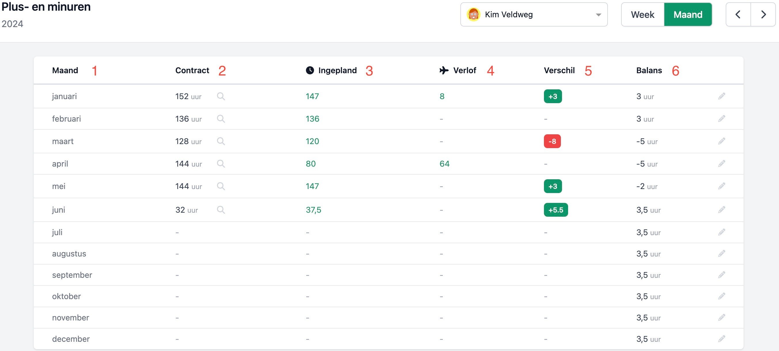 - In deze kolom vind je de maand waarvan je plus en min uren wilt inzien